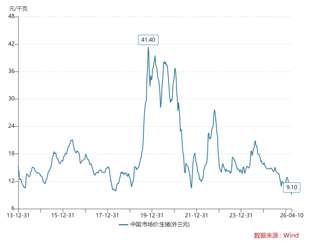 据国家统计局数据,2026年3月下旬生猪(外三元)价格为9.5元/公斤,4月上旬价格为9.1元/公斤,生猪(外三元)价格连续创(至少)近12年的新低。