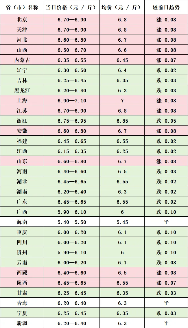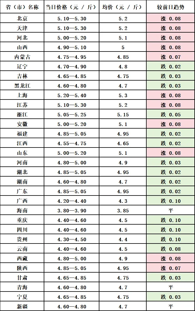 ? ?今日猪价的分化,先看北方阵营!华东、华北、西北部分地区逆势上扬,每斤涨?0.05-0.08?元,上海、北京等地毛猪价格突破?5.2?元?/?斤,成为今日猪价的?“领头羊”。究其缘由,一是政策托底信号持续释放,农业农村部稳价举措不断,养殖端惜售挺价情绪升温,生猪出栏节奏放缓,标猪供应阶段性收紧;二是五一节前备货启动,当地屠宰企业开工率提升,白条猪肉走货加快,需求端短暂发力,双重支撑下,毛猪价格顺势上涨。
