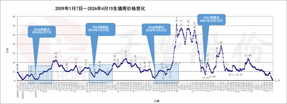 从这张2009年1月-2026年4月的周度猪价走势图,我们可以清晰拆解中国生猪“猪周期”的运行特征: