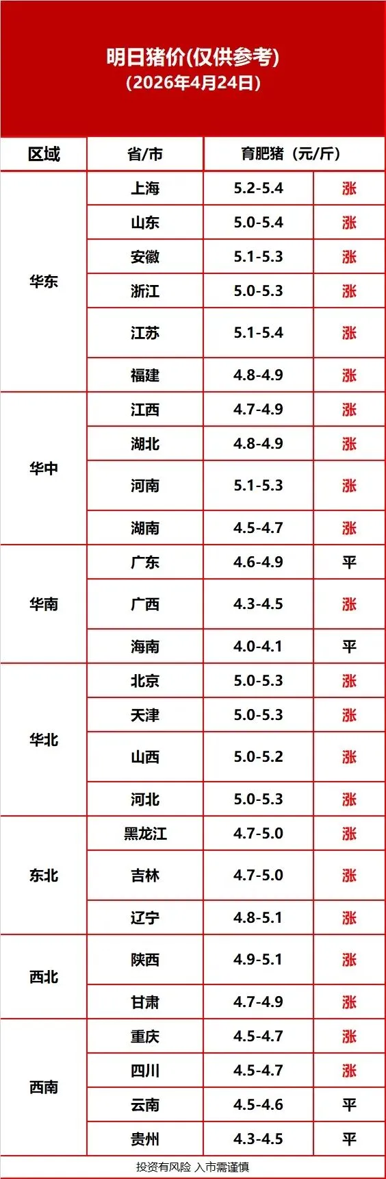 【今日猪价】4月24日全国猪价:延续偏强反弹,北稳南补涨,全国窄幅震荡上行 养羊网 2026-04-24 【今日猪价】4月24日全国猪价:延续偏强反弹,北稳南补涨,全国窄幅震荡上行 养羊网 2026-04-24 上一篇:猪价跌穿十六年新低,猪肉股还能买吗? 下一篇:【今日猪价】2026.4.24猪价上涨一片红 您可能还会对下面的文章感兴趣111: 相关文章 2026年3月7日贵港同发鸡蛋价格 近期价格更新!!! 【明日猪价】2026.2.25 猪价进入“3元时代”?猪企何时走出这轮猪周期