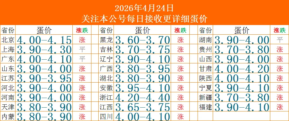 2026年4月24日全国鸡蛋价格3.8-4.10元/斤,山东、河南、河北三大北方核心产蛋大省,今日全部上涨,底价均站稳3.9 元 / 斤,产区涨价带动全国流通价格同步走高。仅供参考!