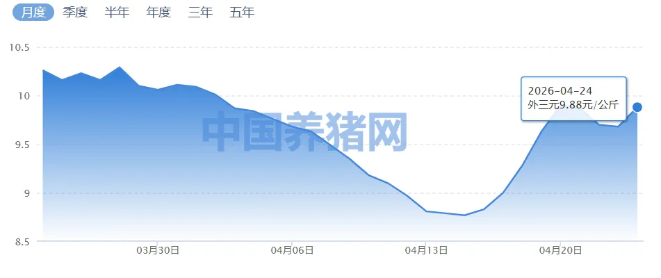 根据中国养猪网2026年4月24日的最新数据,国内生猪市场在经历月初的深度探底后,今日迎来一轮普涨行情,市场情绪显著回暖。全国外三元标猪出栏均价报9.88元/公斤,较昨日上涨0.20元/公斤。