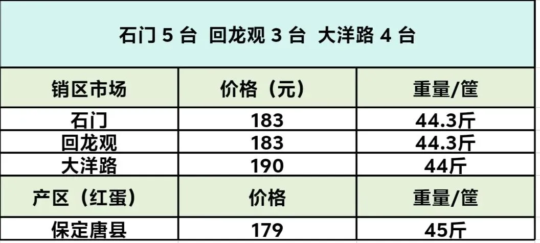 大洋路鸡蛋价格2026年 4 月 24 日报价 养羊网 2026-04-24 大洋路鸡蛋价格2026年 4 月 24 日报价大洋路 4 台,价格 190-187 元,货快,没剩车,明天回车预计 7 台附近。 养羊网 2026-04-24 上一篇:2026年4月24日东莞信立鸡蛋价格早报 下一篇:(4月25日)最新鸡蛋价格预报!更新中 您可能还会对下面的文章感兴趣111: 相关文章 路在何方? 近期价格更新!!! 不是,临沂这家羊肉店里怎么真的养羊啊…… 【猪价日报】2026年4月2日 止跌回升!均价10.10元 7省上涨