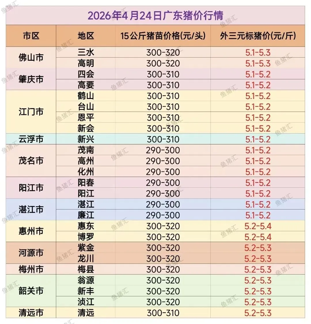 4月24日猪价速递 养羊网 2026-04-24 4月24日猪价速递广东猪苗报290~320元,毛猪报5.1~5.3元,全省各地微升0.2元。(行情仅供参考) 养羊网 2026-04-24 上一篇:2026. 4. 25猪价!全面上涨! 下一篇:【猪价预测】2026年4月25日~4月28日!猪价走势分析! 您可能还会对下面的文章感兴趣111: 相关文章 近期价格更新!!! 7月30日全国外三元猪价汇总 2025年4月13日全国各地生猪价格信息 快看!!山东三支一扶职位表出了!!