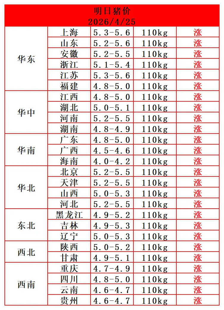 2026-4-25日猪价(明日猪价) 养羊网 2026-04-24 2026-4-25日猪价(明日猪价)立马收到明日猪价! 养羊网 2026-04-24 上一篇:【超前猪价大预测】4月26~4月28日!全国猪价 下一篇:2026.4.25---明日猪价 您可能还会对下面的文章感兴趣111: 相关文章 圈养羊核心技巧:一天喂2次+3种草料+驱虫指 ?超市价格刺客!教你伪装成"穷鬼超市" 猪价呈现稳中偏弱,生猪价格继续探底 全国猪价跌破5元创历史新低;工商银行成为全球首家总资产突破50万亿元的银行;国际油价