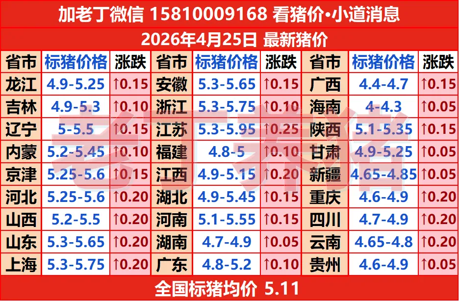 猪价上涨!【明天猪价】4月25日全国和猪圈涨跌表! 养羊网 2026-04-24 猪价上涨!【明天猪价】4月25日全国和猪圈涨跌表! 养羊网 2026-04-24 上一篇:猪价上涨“一片红”! 下一篇:4月25日最新猪价 您可能还会对下面的文章感兴趣111: 相关文章 2025年4月13日全国各地生猪价格信息 近期价格更新!!! 近期价格更新!!! 炸锅!猪价 13% 暴涨后急速变脸!上市猪企 12 月销量曝光:实质性回暖信号仍缺席?