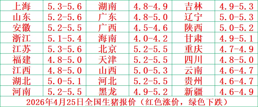 4月25日最新猪价 养羊网 2026-04-24 4月25日最新猪价 养羊网 2026-04-24 上一篇:猪价上涨!【明天猪价】4月25日全国和猪圈涨跌表! 下一篇:4也25日猪价起飞 您可能还会对下面的文章感兴趣111: 相关文章 2025年4月13日全国各地生猪价格信息 ?饼界宝藏发现!密云饼铺 2026年4月7日鸡蛋价格行情趋势分析 美国 鸡蛋 牛奶 肉类价格