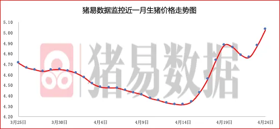 据猪易数据监测数据显示,2026年4月23日标准体重生猪平均价格为10.07元/公斤,较昨日猪价上涨0.29元/公斤,涨幅2.97%,同比25年同期14.95元/公斤下跌4.88元/公斤,跌幅32.64%。