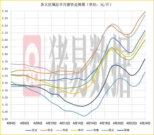 东北、西北、华北、华中、华东、西南、华南地区猪价呈现上涨,生猪平均价格呈上涨态势。