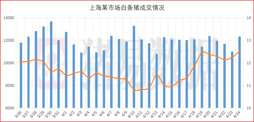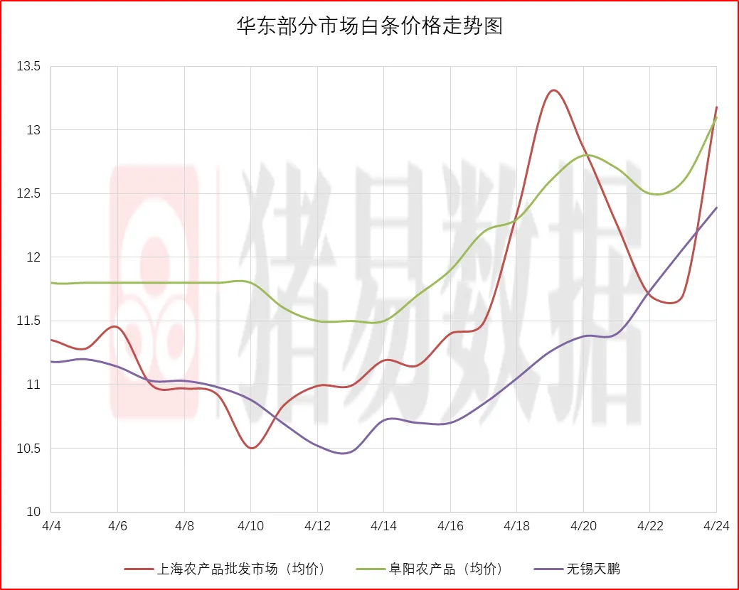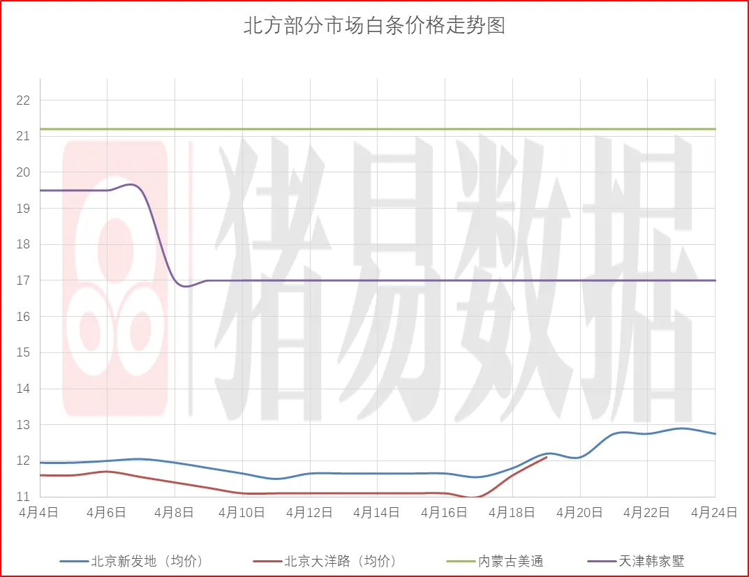 从今日北京、上海消费城市批发市场白条价格走势来看,北京、上海批发市场白条开磅价格呈现稳中伴涨,北京大部分市场开磅价格维持稳定,市场走货速度表现一般;上海市场价格呈现上涨态势,部分市场成交价参考12.53-13.18元/公斤,到货量表现有所增加,市场交易情况表现一般,市场成交均价表现偏好。