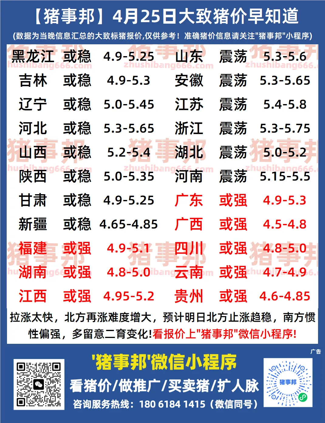 猪事帮|| 4月25日猪价早知道(拉涨太快,或北稳南涨!)