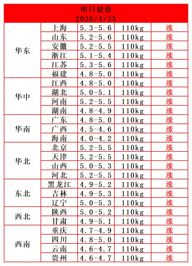 猪价多地又上涨!2026.04.25鼎王猪价播报早知道! 养羊网 2026-04-24 猪价多地又上涨!2026.04.25鼎王猪价播报早知道!立马收到明天最新猪价鼎王金猪就是长得快!订购电话:13980400130 养羊网 2026-04-24 上一篇:【明天猪价】 2026.4.25日全国猪价,涨! 下一篇:【未来三天猪价大预测】4月26~28日 您可能还会对下面的文章感兴趣111: 相关文章 2025年4月13日全国各地生猪价格信息 今日猪市评析:国内猪价以盘整为主,猪价涨跌两难,未来走向成谜? 2026年2月4日-最新猪价 今日走势及网络全年猪价主流预判