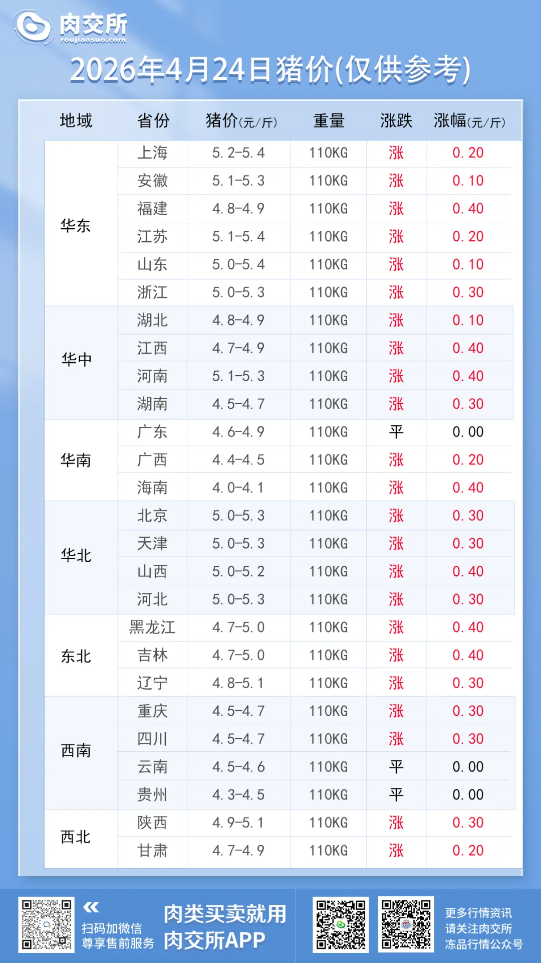 福建、江西、河南、山西、黑龙江、吉林狂涨 0.4 元 / 斤,多省单日涨幅创下本轮反弹新高;