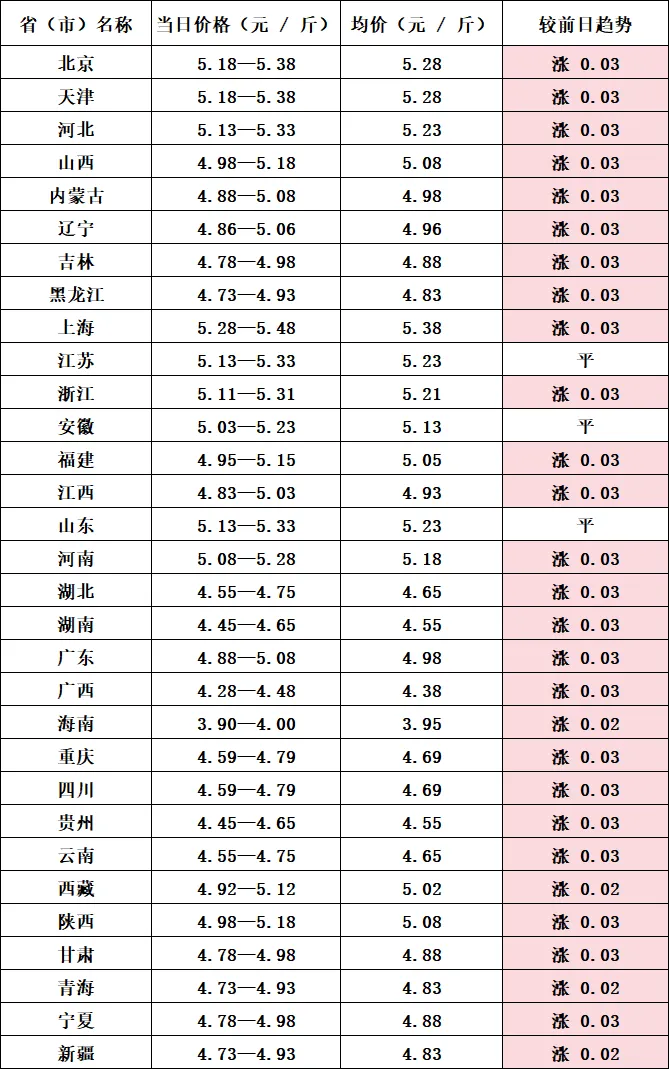 ? ? 先看今日猪价整体走势,全国?31?省(市)中,28?地毛猪、白条猪肉同步上涨,涨幅多在?0.02-0.03?元?/?斤,东北、华北、西南领涨,华东苏皖鲁三省持平。东北三省猪价持续补涨,辽宁、吉林、黑龙江毛猪均价分别达?4.96?元?/?斤、4.88?元?/?斤、4.83?元?/?斤,养殖端惜售挺价情绪浓厚,集团猪场缩量出栏,市场猪源阶段性收紧,推动价格稳步上行。华北地区紧随其后,北京、天津、河北毛猪均价突破?5.2?元?/?斤,屠宰企业五一备货需求释放,收猪积极性提升,供需两端共振支撑价格上涨。