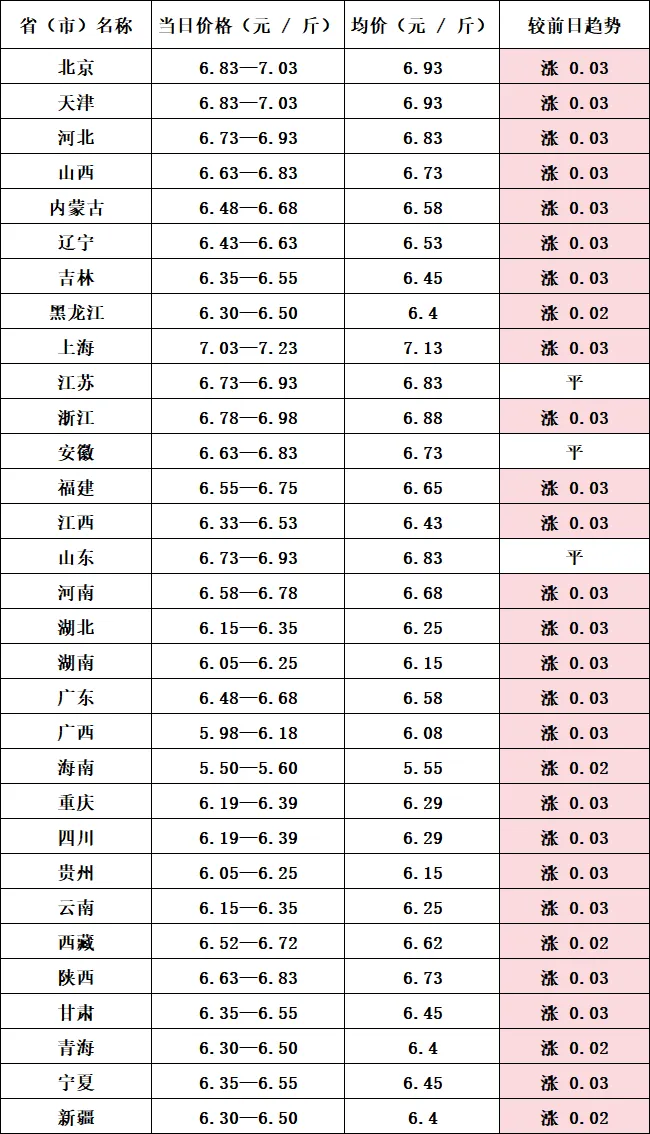 ? ? 西南、华南地区同步回暖,川渝云贵毛猪均价涨至?4.55-4.69?元?/?斤,广西猪价小幅上行至?4.38?元?/?斤,前期压栏大猪有序出栏,标猪供应趋于稳定,叠加本地消费逐步回暖,价格跟涨动力充足。华东地区苏皖鲁三省持平,主因前期涨幅较大,屠宰企业压价采购,养殖端出栏节奏加快,供需暂时平衡,价格进入震荡整理阶段。