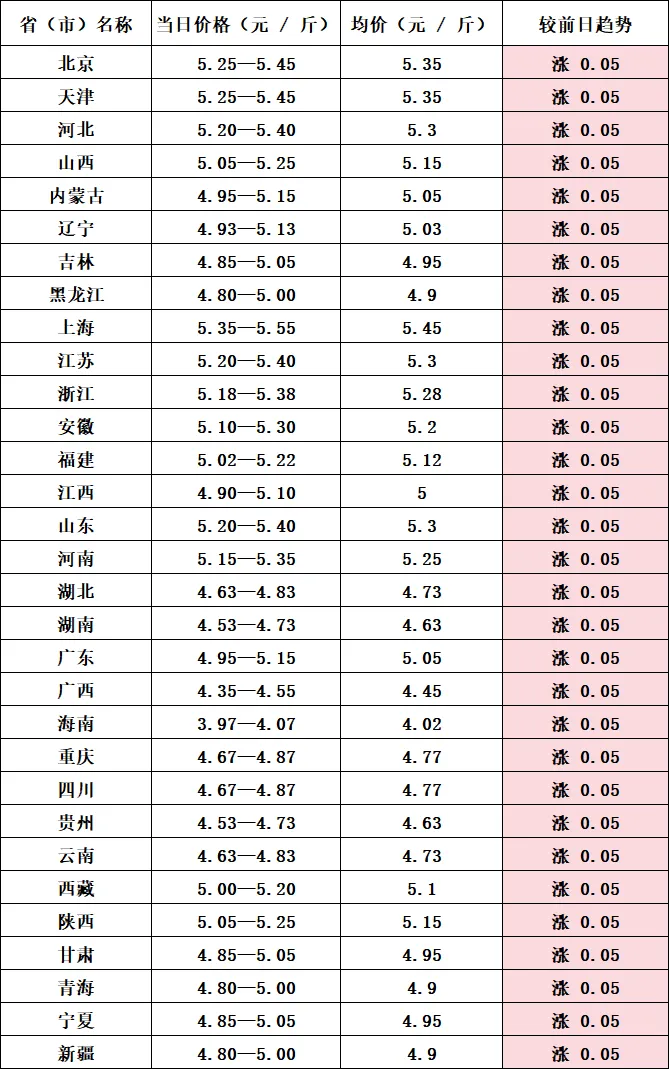 ? ? 今日猪价走势中,生猪市场呈现明显区域分化:华北、华东、东北等主产区涨幅居前,价格率先逼近?5?元?/?斤关口;西南、华南等南方产区涨幅温和,价格仍处相对低位,主因北方养殖端看涨情绪更强、出栏节奏更稳,南方终端消费恢复偏慢。毛猪价格上涨传导顺畅,白条猪肉批发价同步跟涨,批零价差保持稳定,屠宰端盈利空间小幅修复,产业链上下游协同回暖迹象显现。