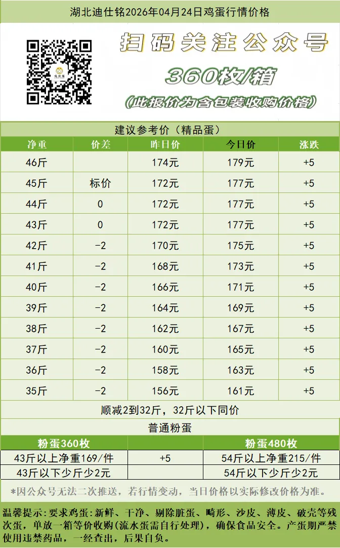 湖北迪仕铭2026年04月24日鸡蛋行情价格 养羊网 2026-04-25 湖北迪仕铭2026年04月24日鸡蛋行情价格 养羊网 2026-04-25 上一篇:贵州农千鸡蛋价格:4月25日!涨! 下一篇:2026年4月25日鸡蛋价格行情参考 您可能还会对下面的文章感兴趣111: 相关文章 4月23日猪价 鸡蛋价格一览|2026年4月3日鸡蛋价格(明日早知道) 2025年4月13日全国各地生猪价格信息 2025年4月13日全国各地生猪价格信息
