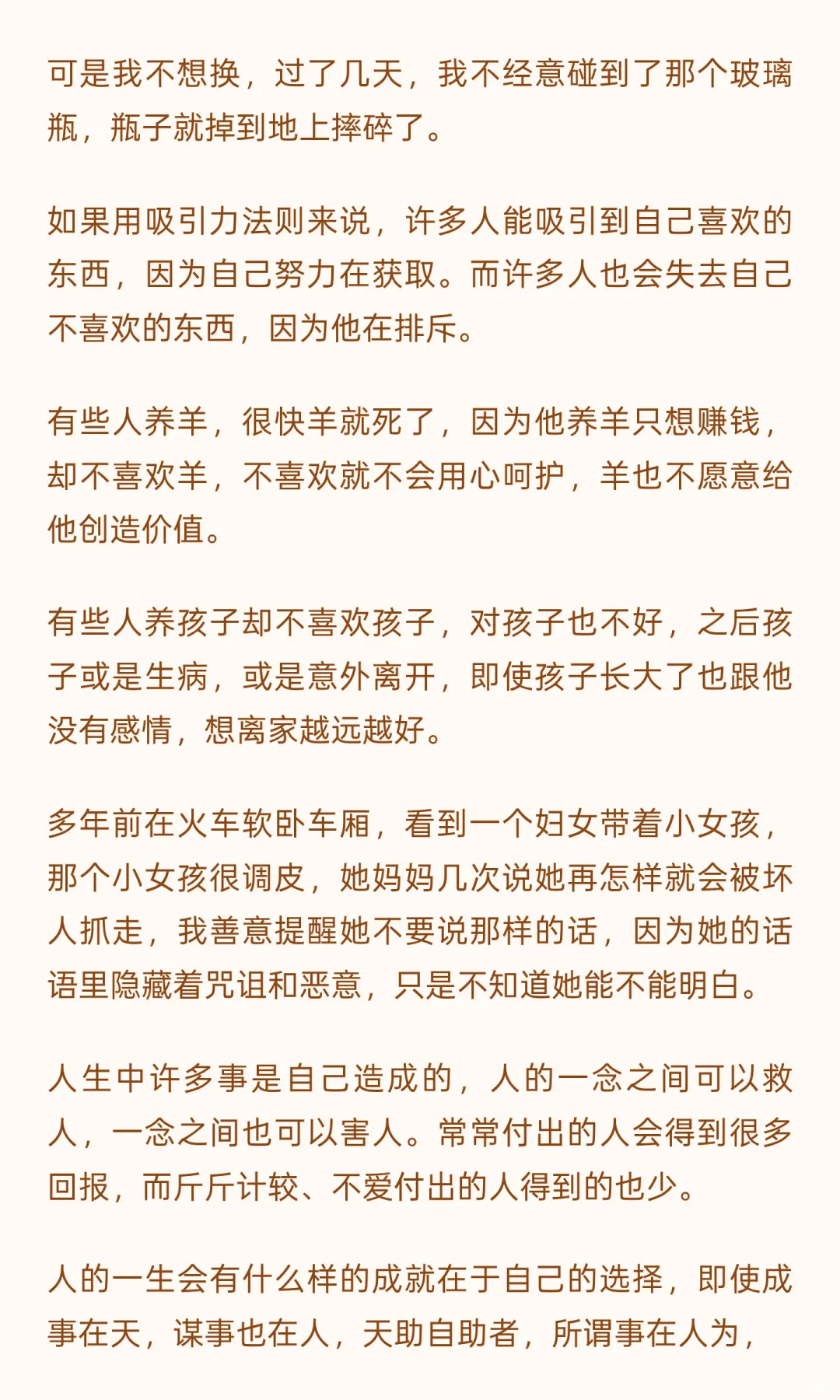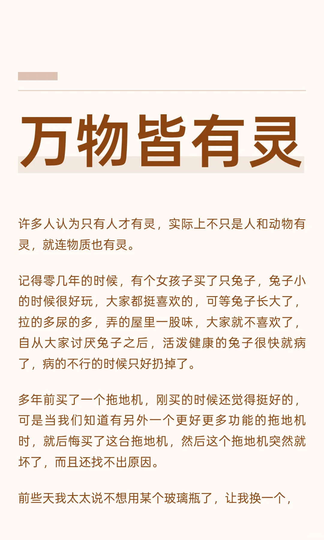 万物皆有灵\n许多人认为只有人才有灵,实际上不只是人和动物有灵,就连物质也有灵。\n记得零几年的时候,有个女孩子买了只兔子,兔子小的时候很好玩,大家都挺喜欢的,可等兔子长大了,拉的多尿的多,弄的屋里一股味,大家就不喜欢了,自从大家讨厌兔子之后,活泼健康的兔子很快就病了,病的不行的时候只好扔掉了。\n多年前买了一个拖地机,刚买的时候还觉得挺好的,可是当我们知道有另外一个更好更多功能的拖地机时,就后悔买了这台拖地机,然后这个拖地机突然就坏了,而且还找不出原因。\n前些天我太太说不想用某个玻璃瓶了,让我换一个,可是我不想换,过了几天,我不经意碰到了那个玻璃瓶,瓶子就掉到地上摔碎了。\n如果用吸引力法则来说,许多人能吸引到自己喜欢的东西,因为自己努力在获取。而许多人也会失去自己不喜欢的东西,因为他在排斥。\n有些人养羊,很快羊就死了,因为他养羊只想赚钱,却不喜欢羊,不喜欢就不会用心呵护,羊也不愿意给他创造价值。\n有些人养孩子却不喜欢孩子,对孩子也不好,之后孩子或是生病,或是意外离开,即使孩子长大了也跟他没有感情,想离家越远越好。\n多年前在火车软卧车厢,看到一个妇女带着小女孩,那个小女孩很调皮,她妈妈几次说她再怎样就会被坏人抓走,我善意提醒她不要说那样的话,因为她的话语里隐藏着咒诅和恶意,只是不知道她能不能明白。\n人生中许多事是自己造成的,人的一念之间可以救人,一念之间也可以害人。常常付出的人会得到很多回报,而斤斤计较、不爱付出的人得到的也少。\n人的一生会有什么样的成就在于自己的选择,即使成事在天,谋事也在人,天助自助者,所谓事在人为,无论天怎么助人,人该做的事还是要做,如果你一天到晚等着天上掉馅饼,那你迟早会饿死。