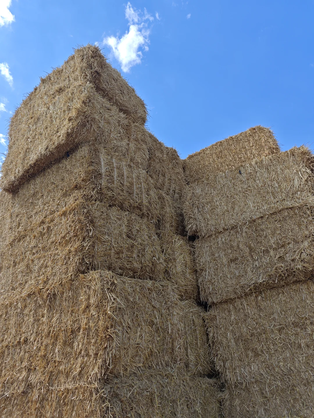 用打包机捆成方块状的麦秸,堆得有两层楼高,在蓝天白云之下被阳光照得金灿灿的。\n在阿勒泰,麦秸主要用于牛羊的越冬饲料。通常夏季会把牛羊赶到阿勒泰山上放牧,冬季则赶进圈里育肥,牛羊不能只吃精饲料(主要是玉米和豆粕),吃太多会胀气而死,所以占比最高的饲料仍然是秸秆。自家麦田里收回来的麦秸和玉米杆,基本没打过药,拿来喂牲口才最放心。\n通常牛羊必须育肥一个月以上才适合屠宰,刚从牧场回来的牛羊又瘦又柴,并且因为吃过太多苜蓿而膻味巨大,只有育肥之后才能去除膻味,同时增加了肌间脂,肉质就鲜香可口了。\n特别提醒各位看官——某地的所谓滩羊因为吃了碱蓬而没有膻味的传说就是营销炒作的结果,试图把好吃的羊肉和地理位置绑定,从而卖出更高价格。碱蓬全国各地都有分布,也没听说哪里用碱蓬来炒作的。羊肉不膻第一还是要看品种,例如北疆的大尾羊的膻味就比普通细毛羊小很多,新鲜羊肉完全吃不出膻味,在反复冷冻、解冻三次之后才勉强能吃出点膻味。大尾羊虽然肉质不嫩,但鲜味香味都更是极品,虽不太适合做涮肉,但做烧烤或者简单水煮就绝对是极品了。膻味也和羊的性别关系很大,母羊和阉羊气味较小,成年公羊则膻味巨大。此外,羊在出栏之前一定不能喂苜蓿,虽然它是优质饲料,但可以把膻味提升一个等级。\n#阿勒泰 #麦秸 #羊肉