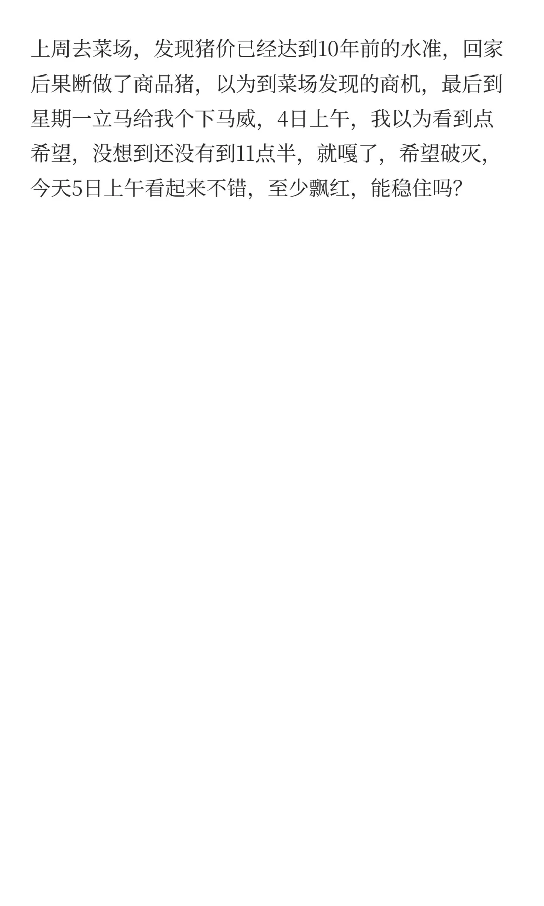 上周去菜场,发现猪价已经达到10年前的水准,回家后果断做了商品猪,以为到菜场发现的商机,最后到星期一立马给我个下马威,4日上午,我以为看到点希望,没想到还没有到11点半,就嘎了,希望破灭,今天5日上午看起来不错,至少飘红,能稳住吗?#期货交易 #交易员 #期货模拟考核对接盘 #生猪