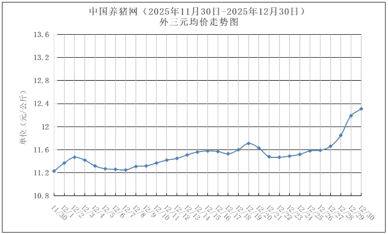 2025年12月30日(星期二),中国养猪网猪价系统数据监测如下:生猪(品种:外三元)均价为12.31元/公斤(6.16元/斤),价格较昨日上涨了0.12元/公斤(0.06元/斤);