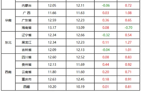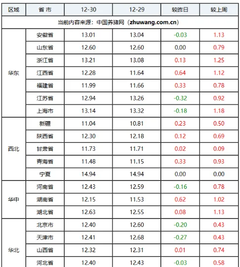 根据"2025年12月30日-中国养猪网生猪(外三元)均价涨跌表"发现,今日全国外三元生猪价格延续上涨态势,均价达到12.31元/公斤,较前几日有明显提升,呈现大面积飘红的局面。