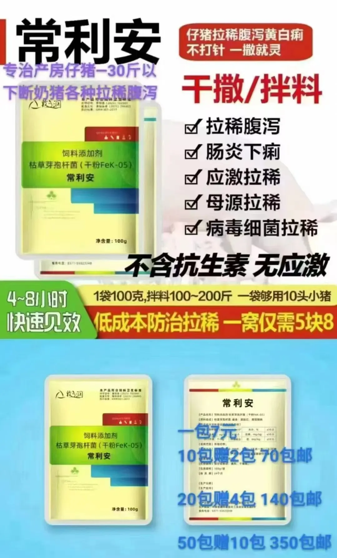 【常利安】在手养殖无优,让咱们不再为了30斤以下小猪拉稀而烦恼。现在咱们回馈新老客户一包7块,10包送2包,70元发12包!