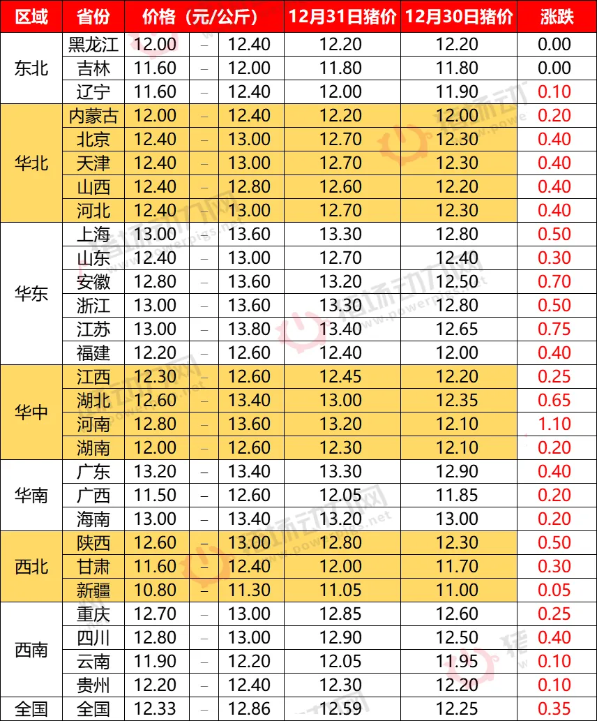 据统计,12月31日,屠宰企业散户主流收购120公斤-130公斤标准体重生猪平均价格为12.59元/公斤,较昨日价格上涨0.35元/公斤。2个省份猪价企稳,26个省份猪价上涨。 目前全国最高价为江苏,价格为13.40元/公斤,较昨日价格上涨0.75元/公斤;全国最低价为新疆,价格为11.05元/公斤,较昨日价格上涨0.05元/公斤。