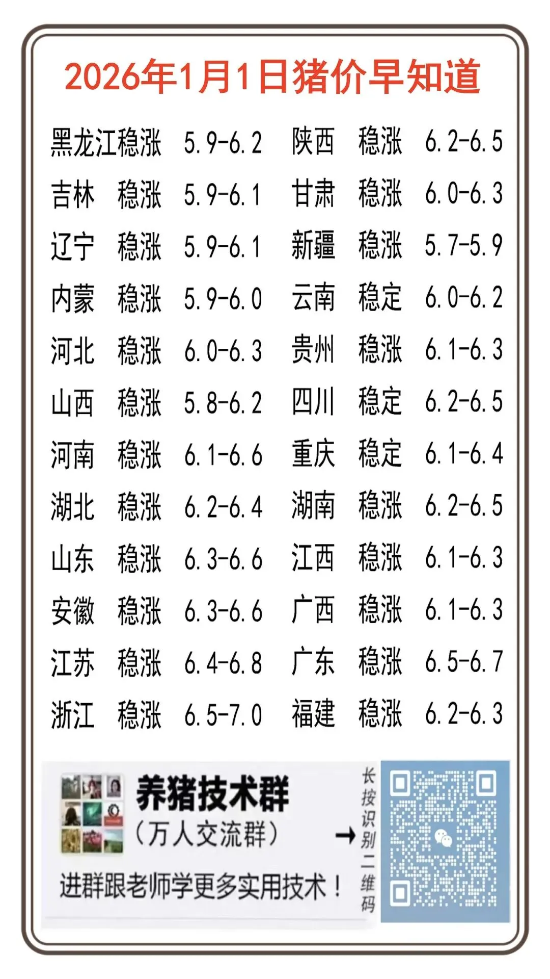 开门红!2026年1月1日猪价一片红! 养羊网 2025-12-31 开门红!2026年1月1日猪价一片红! 养羊网 2025-12-31 上一篇:猪价大部偏强,市场有破位上涨的机会? 下一篇:大涨!猪价连续2日上涨,幅度高达1元,后市如何走? 您可能还会对下面的文章感兴趣111: 相关文章 鸡蛋价格有底吗? 2025年4月13日全国各地生猪价格信息 整个宇宙都会来帮你|正念壁纸 iPad壁纸? 近期价格更新!!!