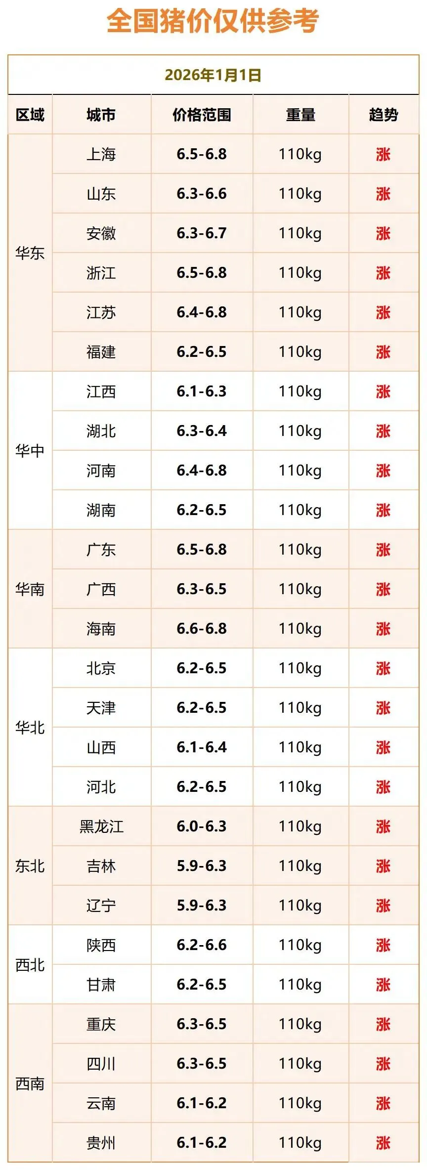 明日猪价早知道~开门红!全国地区猪价大涨! 养羊网 2025-12-31 明日猪价早知道~开门红!全国地区猪价大涨!猪价播报2026年1月1日全国猪价播报全国猪价播报~END~长按识别二维码关注我们 养羊网 2025-12-31 上一篇:大爆发,猪价上涨“涨翻天”!附:1月1日猪价 下一篇:【明日猪价】1月1日全国最新猪价(全面上涨) 您可能还会对下面的文章感兴趣111: 相关文章 近期价格更新!!! 近期价格更新!!! 正宗散养黑山羊 2025年4月13日全国各地生猪价格信息