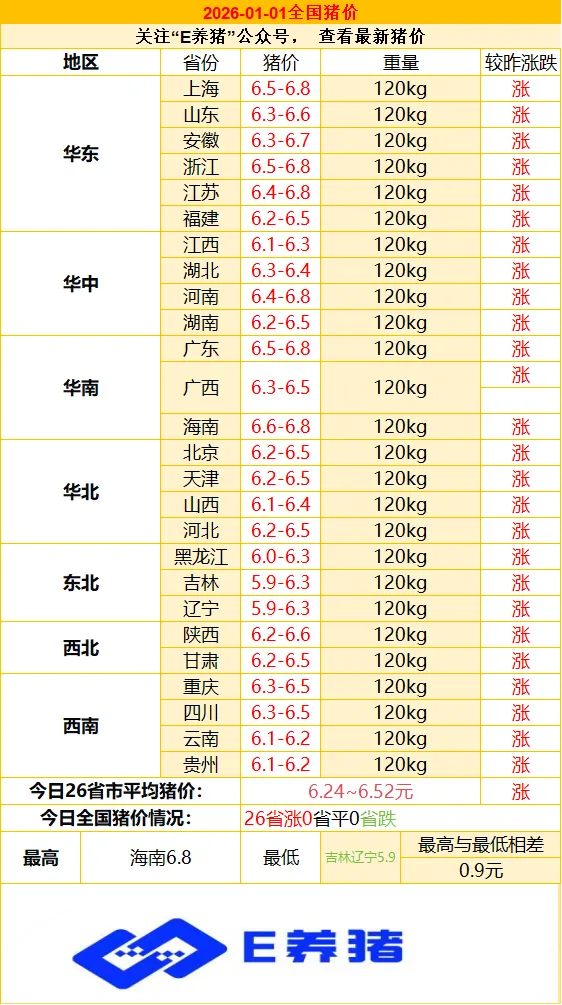 1月1日猪价继续爆涨、你的猪卖了么?每天发布猪价,定期分享优秀求职人员信息及猪场问题实战案例解析!关注“E养猪”,助力猪场高效生产!