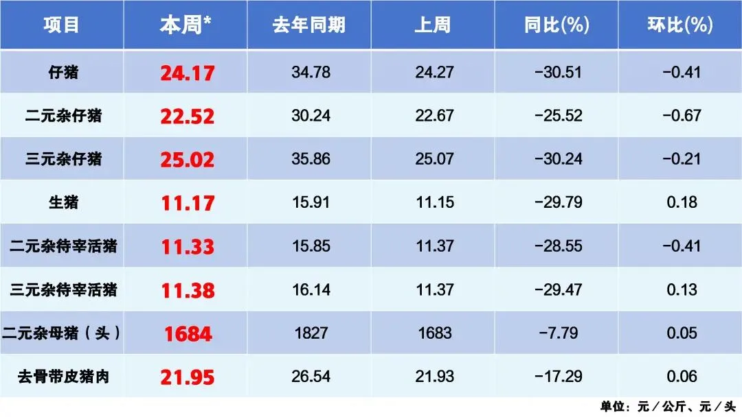 本周仔猪均价为24.17元/公斤,环比微跌0.41%,同比大幅下跌30.51%。其中三元杂、二元杂仔猪价格同比跌幅均超过25%,显示养殖户对未来生猪价格预期不乐观,补栏积极性较低。仔猪价格作为生猪产能调整的先行指标,其持续疲软反映出行业整体处于“去产能、控规模”阶段,预计未来6个月左右生猪出栏量可能逐步回落,但短期内供应压力仍存。