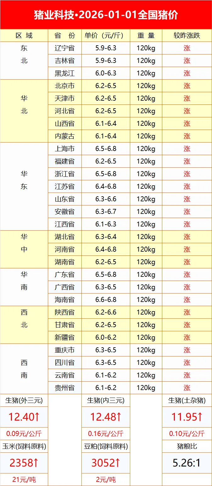 2026-01-01明日猪价(喜迎元旦,强势上涨!) 养羊网 2025-12-31 2026-01-01明日猪价(喜迎元旦,强势上涨!)? ?别忘了点个在看哦? 养羊网 2025-12-31 上一篇:广西猪价(2025年12月第4周) 下一篇:【明天猪价】2026.01.01日全国猪价 您可能还会对下面的文章感兴趣111: 相关文章 2025年4月13日全国各地生猪价格信息 近期价格更新!!! 近期价格更新!!! 2025年4月13日全国各地生猪价格信息