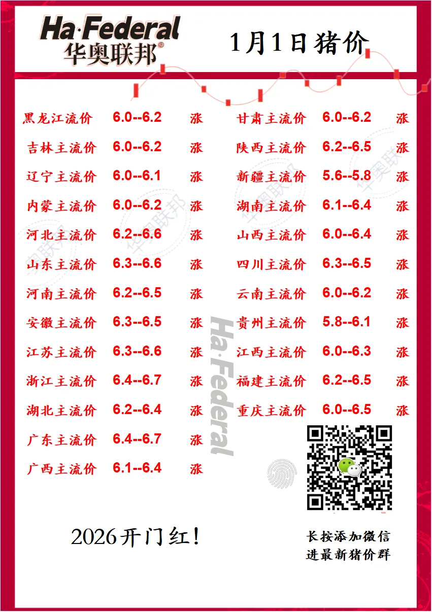 1月1最新猪价 开门红 养羊网 2025-12-31 1月1最新猪价 开门红进最新报价群 加微信 v联系电话:137 ?0084 ?5054 养羊网 2025-12-31 上一篇:【明天猪价】2026.01.01日全国猪价 下一篇:1月1日全国生猪价格——新年元旦!猪价全面爆发,破6冲7! 您可能还会对下面的文章感兴趣111: 相关文章 再也不接白菜价的毛了 2025年4月13日全国各地生猪价格信息 4月7日牛肉、羊肉价格 2025年4月13日全国各地生猪价格信息