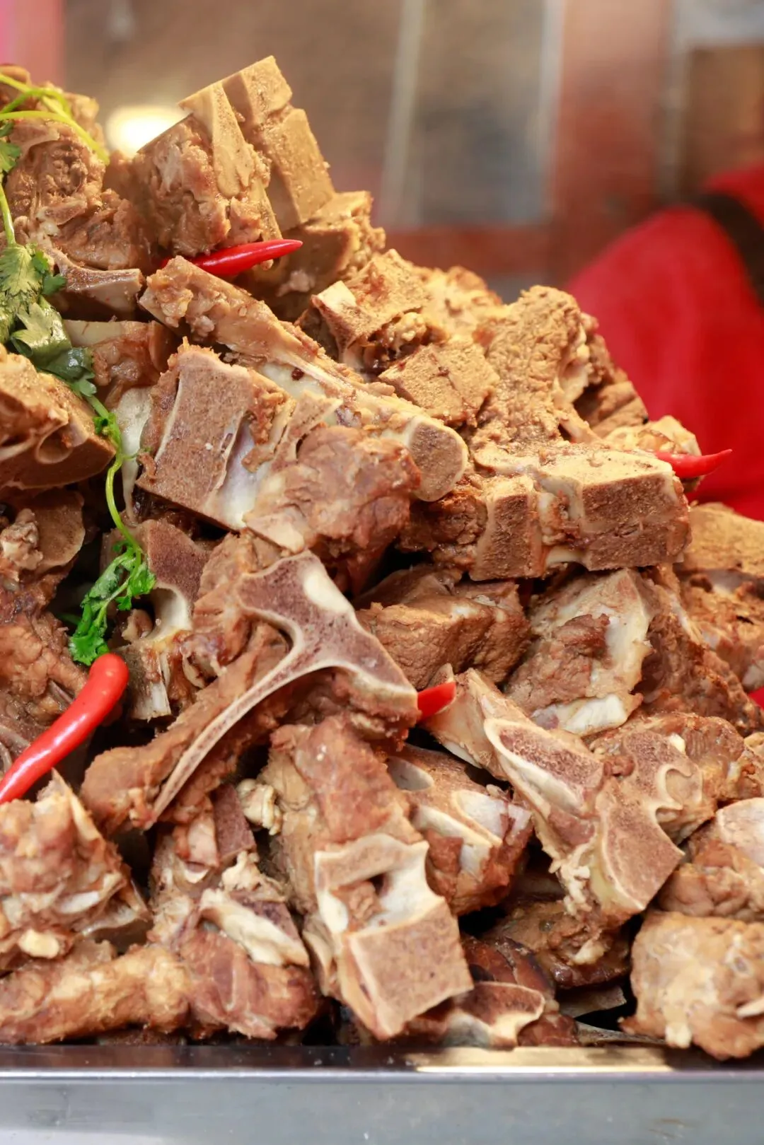 冒着热乎气的通辽早市,在两三张小饭桌的抻面摊上,啃骨头比赛正式开席。这桌是脊骨,那桌是尾骨,邻桌是扇骨,肉蓬松地如同云朵一般,光是撕咬就足够有快感,大口大口吃,千万别矜持。一大盘酱骨头,配上一枚茶蛋一碟咸菜,够硬也够丰富。