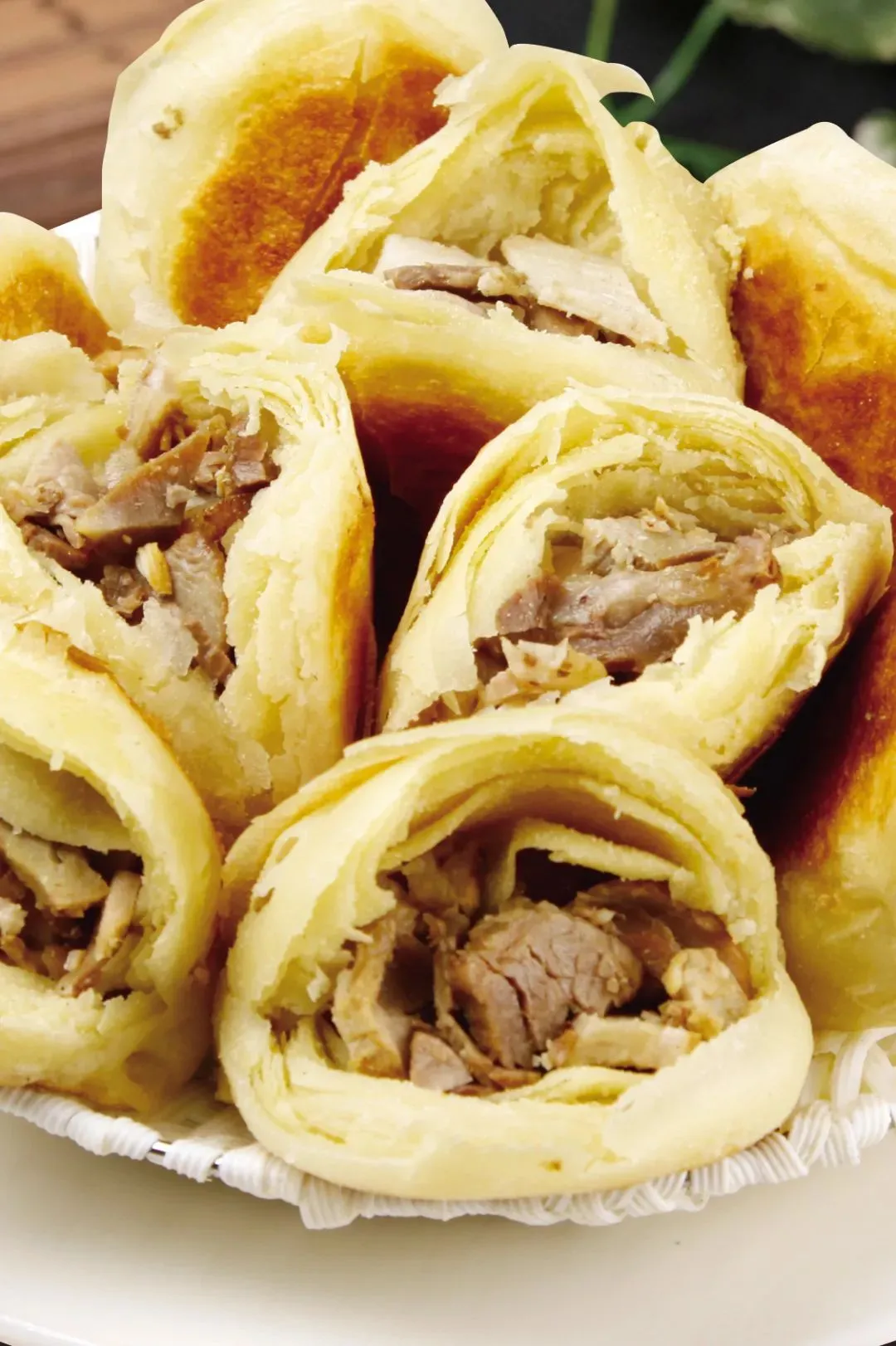 赤峰“不怎么东北”的一面,兼容了东北的豪爽与草原的热情,体现在早点上就是“对夹”。用小米面与煮肉猪油揉出的三十二层酥皮,构成了赤峰饼,半肥半瘦的膘子肉,用了松木熏烤(讲究点的还会用红糖蒸汽熏烤),熏出了木香混着甜香的赤峰肉。刚出炉的面饼被剖开,一拉、一塞,肉尽数落入其中。纯肉派、肥瘦各半派、双料派、无肉派,怎么夹都是对的。