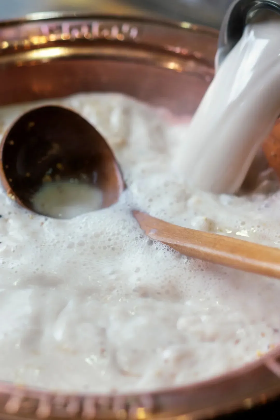 锅茶,顾名思义就是一锅沸腾的奶茶。为什么要用锅来装?因为奶茶太大,大杯不够,一锅才达标。豪爽自在的内蒙古,要的就是纯天然的奶茶自由。锅底用黄油、炒米、肉粒,经高温预炒出淡香,再加上奶茶熬煮,就散发出了安心的醇香。