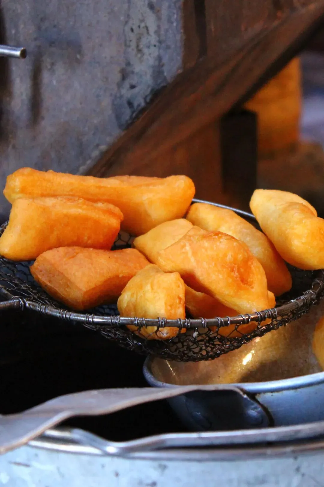 用来搭配酿皮的麻叶,同样用河套面粉、胡麻油做出来的早点,面团入油锅中炸到四瓣鼓起,出锅时红黄相间、色泽鲜艳,淋上深红色的糖稀,吃起来松软香甜。