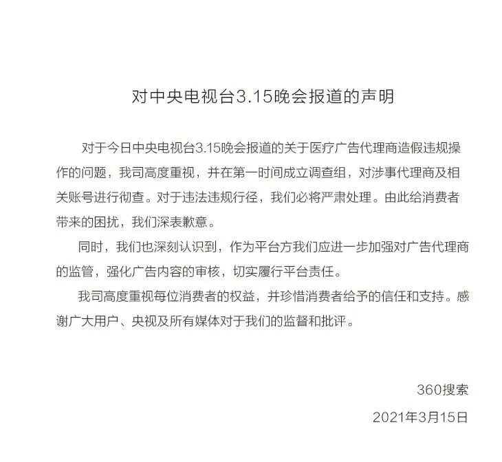 据介绍,青县共有养殖场664家,存栏育肥羊48万只,全年出栏70万只;共有屠宰厂4家,年屠宰量50万只。此次曝光的涉事企业位于新兴镇,这个镇共有规上养殖场(1000只及以上)160家,存栏21.9万只。 360搜索号称“永远不做医疗广告”, 转头就扎了进去 在3·15晚会中,央视点名报道了360搜索关于医疗广告代理商造假违规操作的问题。360旗下公司成都龙擎网络为虚假广告的发布推波助澜。 据央视报道,记者仅提供了一个微信号和产品类型,360上海广告总代理公司就制作出一篇内容为减肥、降血糖的自述广告和一篇有问必答、快速问医师的专家答疑广告。专家子虚乌有,疗效神乎其神,评论也是事先写好的,就连点赞数量也可以根据需要任意设定。 360广告代理公司山西晋商讯网络科技有限责任公司销售经理说:“这些都是假的。哪去找这么多人去评论,这都是页面来的时候,有代码直接就做好了。”交了钱就能上,记者在UC浏览器和360搜索上进行搜索,找到了代理公司制作的这两则虚假广告。 据天眼查经营风险显示,涉事公司360旗下成都龙擎网络科技有限公司此前有一条行政处罚记录,处罚事由为发布未经核实的广告,决定文书号为青羊市监(工商 )罚字〔2019〕13号。 而山西晋商讯网络科技有限责任公司,2018年7月曾因“广告经营者为内容不实或者证明不全的户外广告提供设计、制作、代理服务行为”被行政处罚,罚款2万元,处罚单位为山西省市场监督管理局。 公开资料显示,360早在2012年、2013年先后通过360搜索和周鸿祎本人微博宣布放弃医疗广告。时任360总裁齐向东也于2013年对媒体强调,360永远不做医药广告。2016年“魏则西事件”发生后,360再次高调宣布,“市场第二,良心第一,我们决定彻底清除医疗商业推广!” 然而,在高额利润下,360搜索仍然一头扎进医疗广告。 3月15日晚,360搜索官方微博就央视3·15晚会报道的360搜索医药广告造假链条问题发表声明:对涉事代理商及相关账号进行彻查。对违法违规行径,必将严肃处理,给消费者带来的困扰深表歉意。