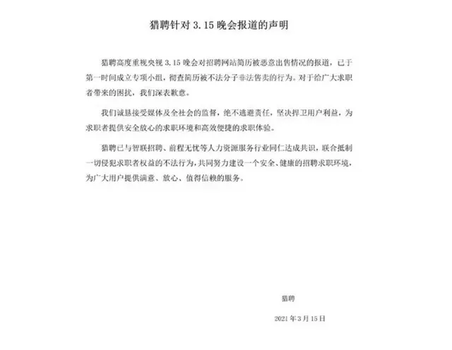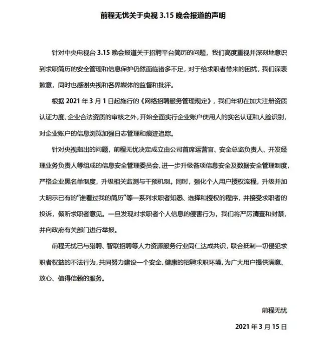 诱导老年人下载App,违规收集个人信息 3·15晚会曝光了手机清理垃圾App骗局,部分App通过广告诱导老年人反复下载清理软件。当晚,上海市通信管理局发布通报称,针对曝光问题对上海苏帕科技有限公司开展调查。3月16日,该软件已在多个应用商店下架。 3.15晚会曝光了内存优化大师、智能清理大师、超强清理大师、手机管家pro四款App,经工信部查实,其存在欺骗误导用户下载、违规处理个人信息等问题,已要求主要应用商店予以下架,并组织北京、天津、上海、广东四省市通信管理局对涉事企业主体进行调查处理。 前期专项整治行动中,工信部针对存在欺骗误导用户下载问题的App,责令整改300款、公开通报37款、下架3款;针对存在违规处理个人信息问题的手机管家、内存优化、垃圾清理类App,责令整改75款、公开通报20款、下架1款。 招聘简历被售卖: 给钱就可以买到简历和个人信息 3·15晚会曝光智联招聘售卖简历。在贴吧、论坛、qq群等渠道,支付7元可以得到智联招聘简历。卖家称,只要给钱就可以买到智联招聘简历。 这些个人简历是如何被泄露并在QQ群里被贩卖的呢?记者发现,在智联招聘上,企业账户只要交钱办理会员,就可以不受数量限制下载包含姓名、电话及邮箱地址等关键信息的完整简历。 还有人在兜售智联招聘的企业账户。企业账户的注册,伪造的资质申请也可以通过。 类似的问题不仅仅发生在智联招聘。前程无忧和猎聘网上,企业账户只需支付费用,便可以下载到求职者的完整简历,对企业账户同样存在管理漏洞。 问题曝光后,猎聘、前程无忧、智联招聘相继在3月15日深夜、3月16日凌晨公开道歉。