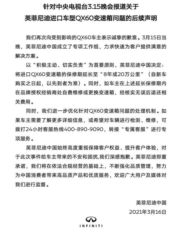 英菲尼迪、长安福特变速箱问题: 问题由来已久,“顽疾”多年不治 3·15晚会曝光了英菲尼迪进口车型QX60的变速箱问题,出现异响、油门和刹车失灵等。 实际上,英菲尼迪QX60变速箱问题从2015年开始持续不断出现,部分车主已经更换了两次甚至三次变速箱总成,可更换的新变速箱在行驶几千公里后,同样的问题再次出现。 3月15日、16日,英菲尼迪就QX60变速箱故障等问题接连发布两篇声明,称决定将进口QX60变速箱保修期延长至“8年或20万公里”(自新车购买之日起,以先到者为准)。