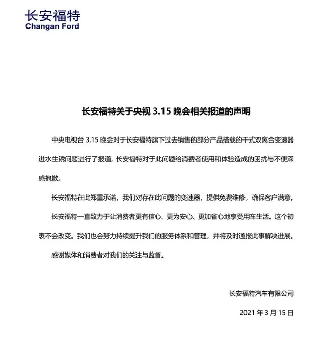 3·15晚会还曝光了福特翼搏、福克斯的变速箱故障问题,福特翼搏、福克斯的多位车主表示,车辆行驶中突然出现无法加减挡的情况。 事件曝光之后,长安福特发表声明,对消费者使用和体验造成的困扰与不变深感抱歉。长安福特承诺,将对此问题的变速器提供免费维修,确保客户满意。