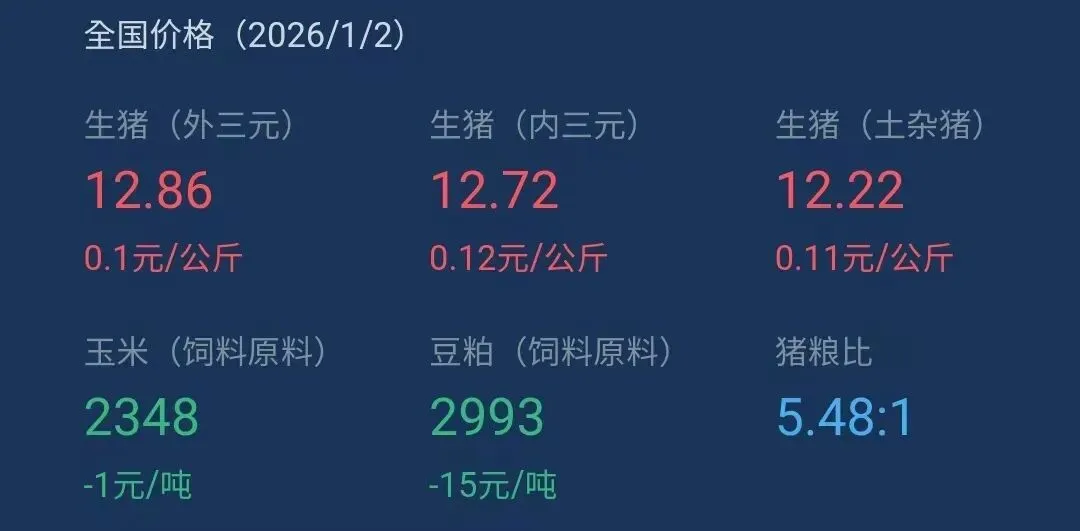 一、今天(2026年1月2日)全国生猪标准体重平均价格12.6-13.0元/公斤,同比昨日(2026年1月1日)价格下跌0.1元/公斤。