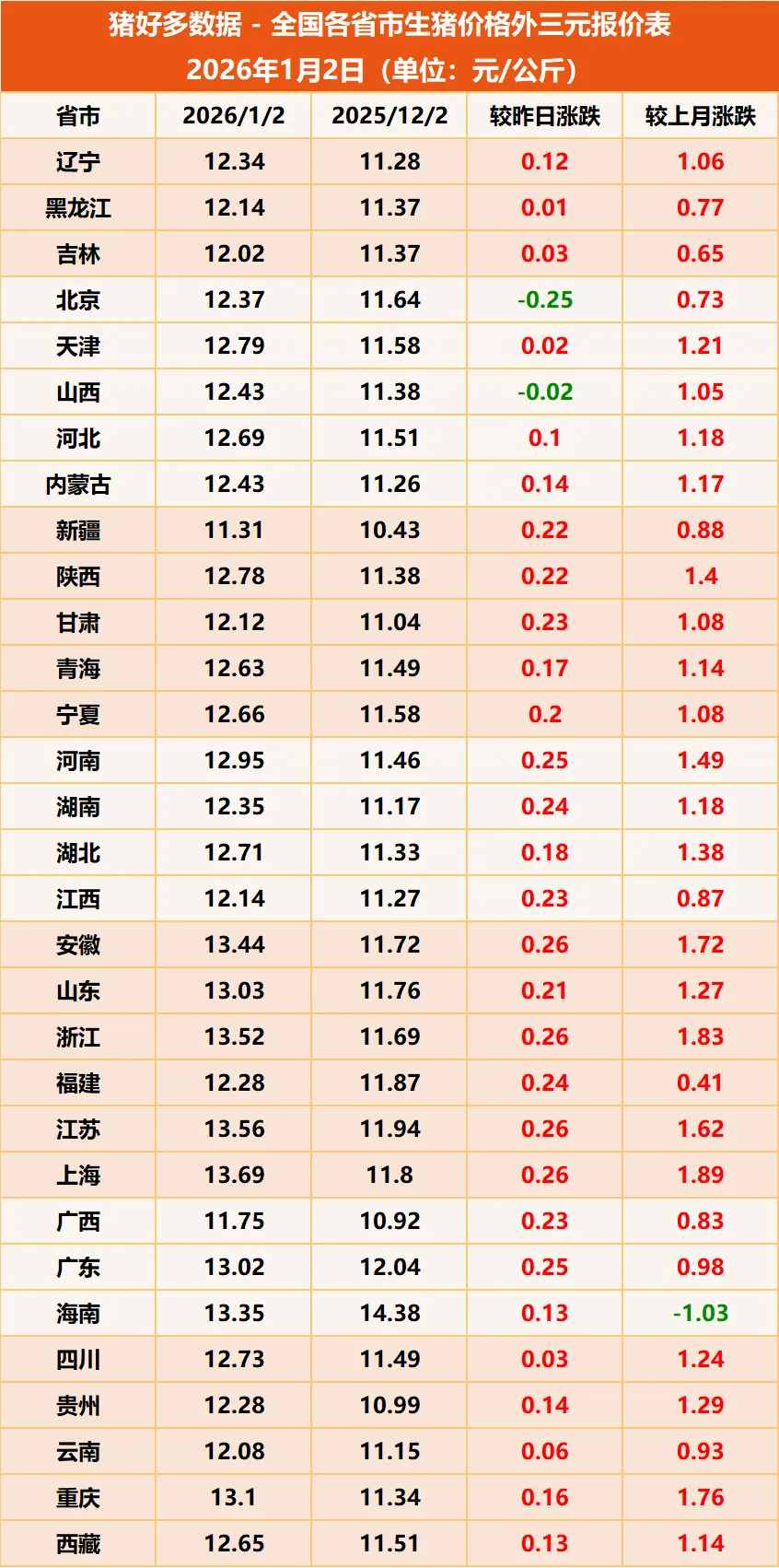 据猪好多数据监测,1月2日全国外三元生猪均价为12.63元/公斤,较昨日上涨0.06元/公斤,全国三十多省全面飘红(仅有北京、山西小幅回落),并且这已经是自12月27日触底以来的六日连涨,目前最高价已涨到13.69元/公斤,直冲7元区间!