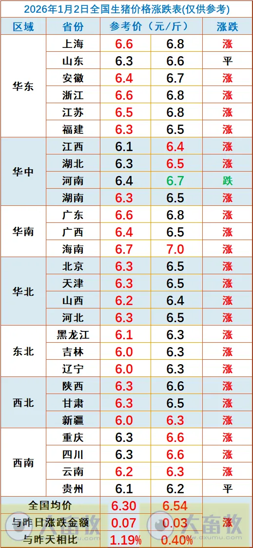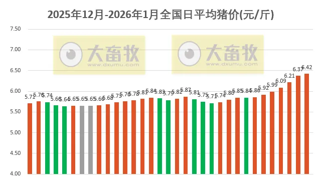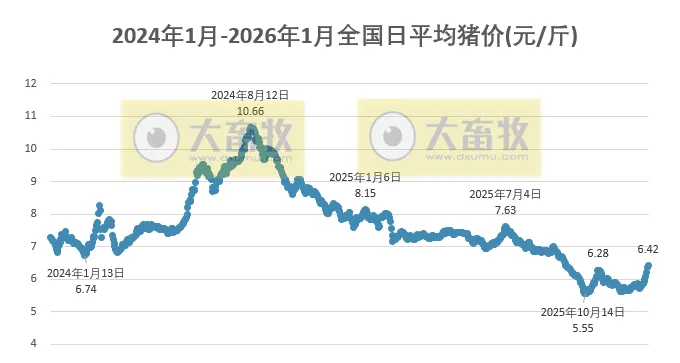 大畜牧根据27省的猪价数据,计算出2026年1月2日全国平均猪价为每斤6.42元,比昨天上涨0.05元,涨幅为0.79%,涨幅收窄,连续7天上涨,累计上涨0.58元,还是近106天最高价。