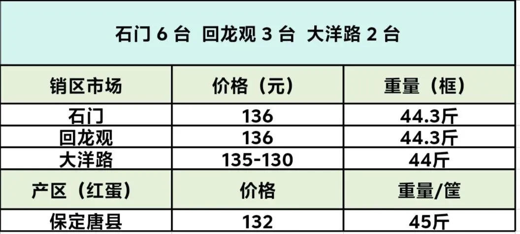 大洋路鸡蛋价格2026年 1 月 2 日报价 养羊网 2026-01-02 大洋路鸡蛋价格2026年 1 月 2 日报价大洋路到 2 台,价格 135-132 元,货少没剩车,明天回常车少预计 2-3 台附近。 养羊网 2026-01-02 上一篇:猪价低迷周期下上市猪企的财务承压与突围路径 下一篇:2026年01月01日: 湖南鸡蛋价格,三尖常德长沙益阳永州衡阳怀化. 您可能还会对下面的文章感兴趣111: 相关文章 近期价格更新!!! 2025年4月13日全国各地生猪价格信息 Egg prices rising 2月6日有哥供应链新闻早知道??