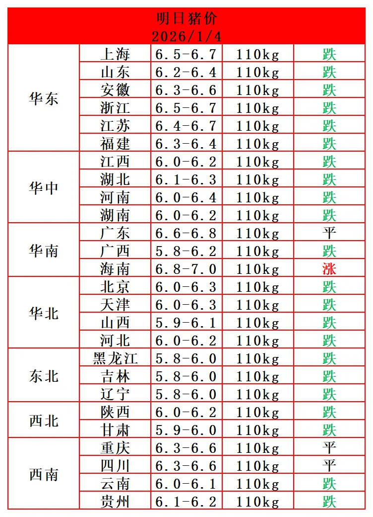 2026.1.4-今日最新猪价 养羊网 2026-01-04 2026.1.4-今日最新猪价 养羊网 2026-01-04 上一篇:1月3日鸡蛋价格早报参考 下一篇:2026年1月3日鸡蛋价格最新报价行情参考 您可能还会对下面的文章感兴趣111: 相关文章 2025年4月13日全国各地生猪价格信息 10塊錢一底香港雞蛋仔!價錢時光倒流30年! 2025年4月13日全国各地生猪价格信息 一起买羊吧