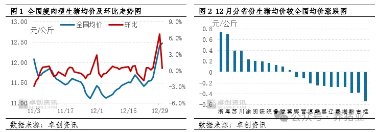 进入12月,月初业内根据养殖端减重增量预期及需求端增量不足的假设下,对本月猪价看跌预期偏强。前期供应端加速出栏而市场消化能力偏强,前期市场处于供需僵持状态。而后期随着养殖端出栏逐步下滑而腌腊需求逐步增量,大猪供应缺口扩大支撑猪价结束震荡期而快速上涨。据卓创资讯监测数据显示,截至12月30日,全国瘦肉型生猪均价为11.52元/公斤,环比仅微跌0.54%,降价明显不及预期。通过对分省份月均价减全国均价幅度对比发现,超全国均价较多省份为浙江、广发、江苏、四川和重庆等,以销区为主,而低全国均价较多省份为广西、吉林、贵州和湖南,以产区为主,销区支撑力度强于产区。