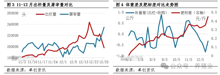 12月前期北方普遍降温,屠宰端宰量增幅明显,养殖端亦开启减重增量模式,出栏节奏加快。而西南、华南等地气温迟迟未降,腌腊始终不温不火,大猪看涨预期降低,养殖端开始加速出栏。而随着气温延迟下降,西南、皖南、苏南、两湖等地腌腊开始启动,河南、山东等地灌肠亦助阵需求增量,导致在月末呈现屠宰端持续增量而养殖端因出栏体重下滑、出栏减少的情况,剪刀差走势明显。