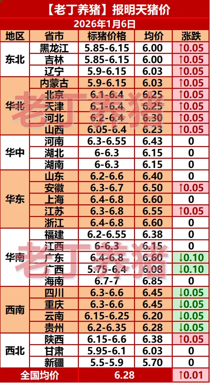 猪价有涨!【明天猪价】1月6日全国猪价涨跌表!关注老丁养猪